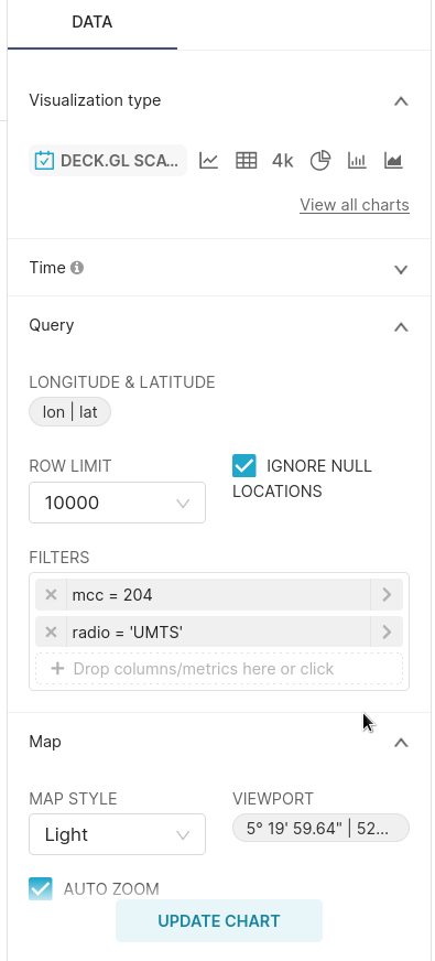 A deck.gl Scatterplot requires a longitude and latitude, and one or more filters can also be applied to the query. In this example two filters are applied, one for cell towers with UMTS radios, and one for the Mobile country code assigned to The Netherlands.