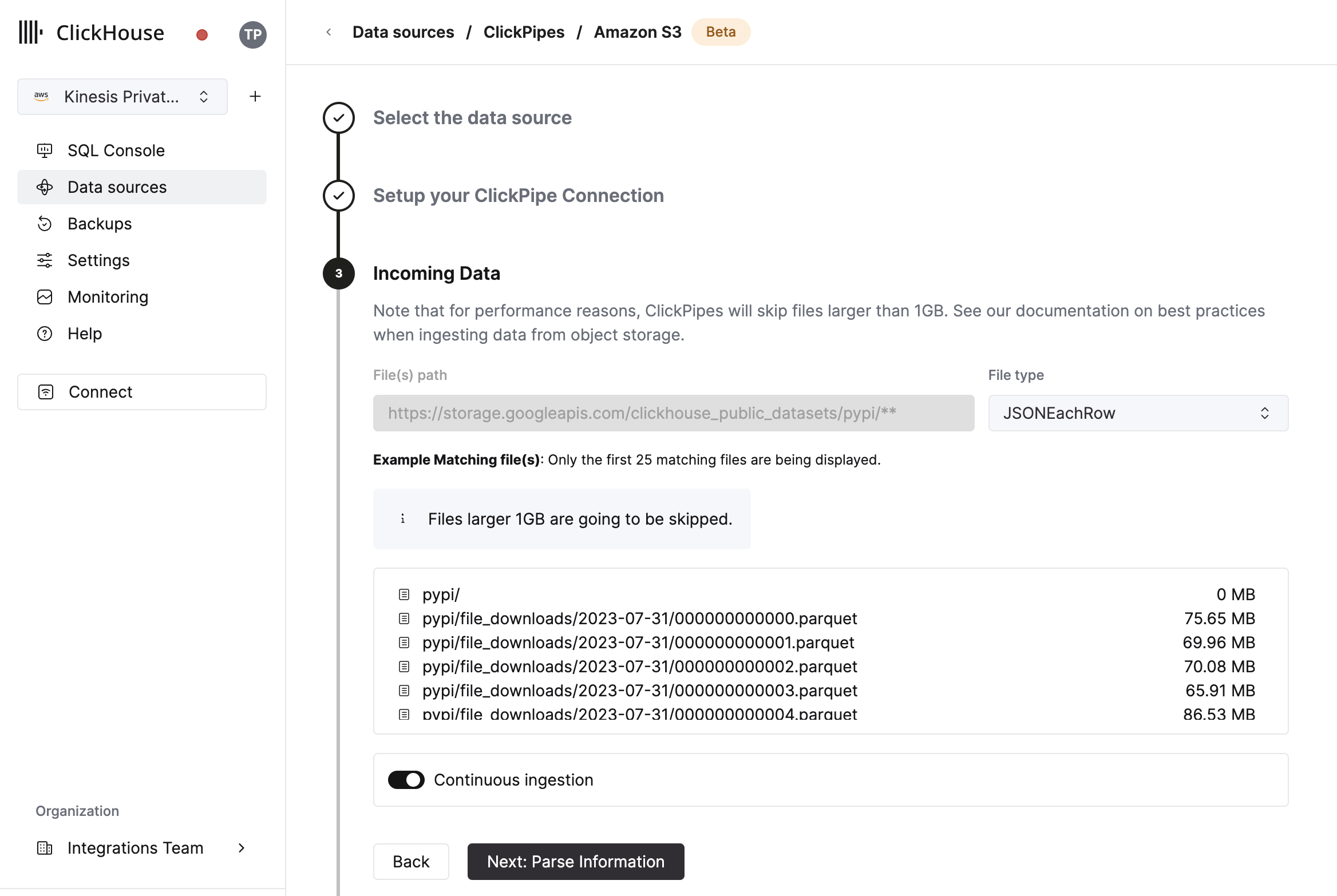 The UI will display a list of files in the specified bucket. Select your data format (we currently support a subset of ClickHouse formats) and if you want to enable continuous ingestion More details below.