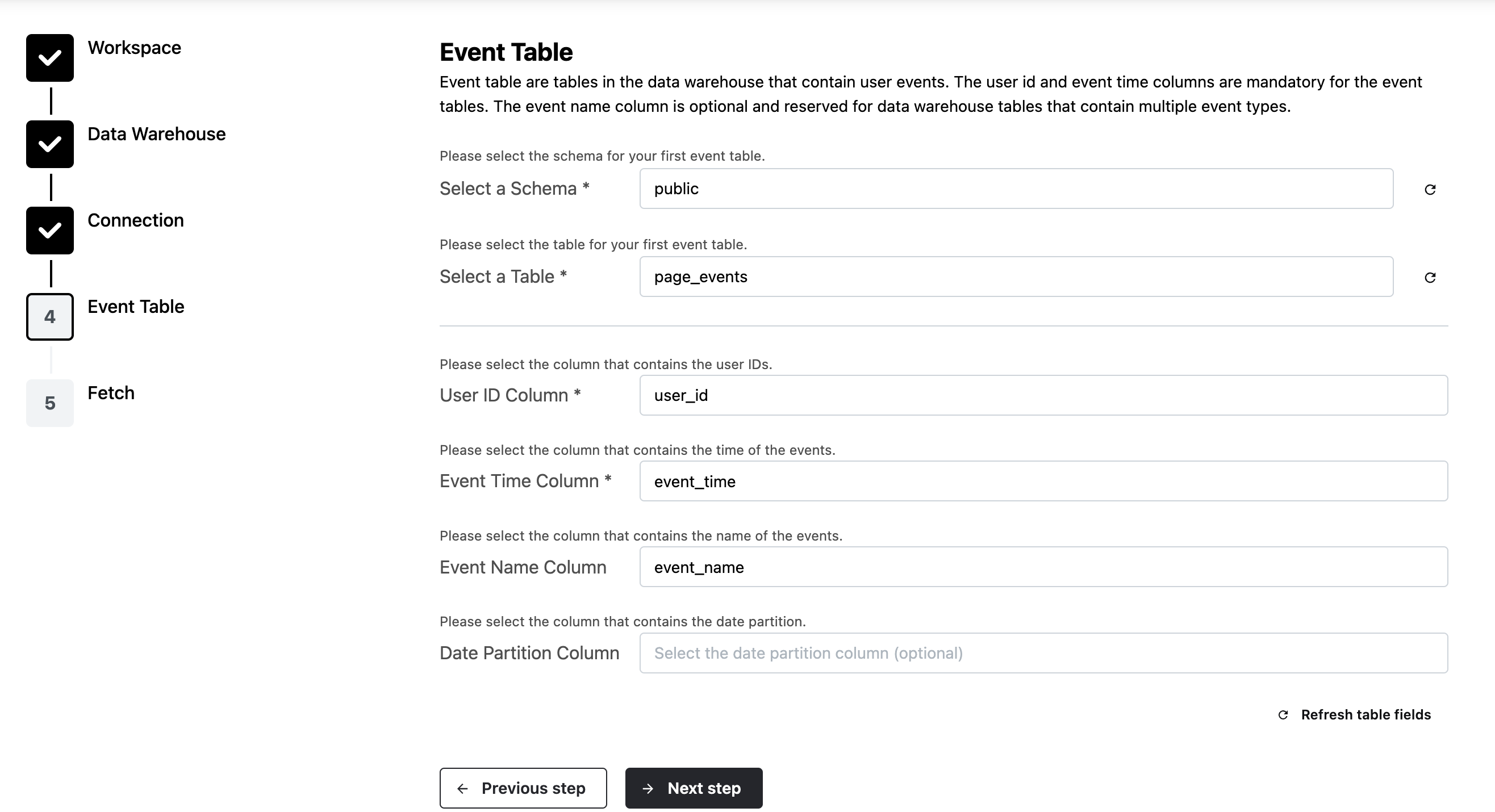 Once you added all other event tables to your workspace. You need to configure those as well. Configure the user id, event time and optionally the event name columns.